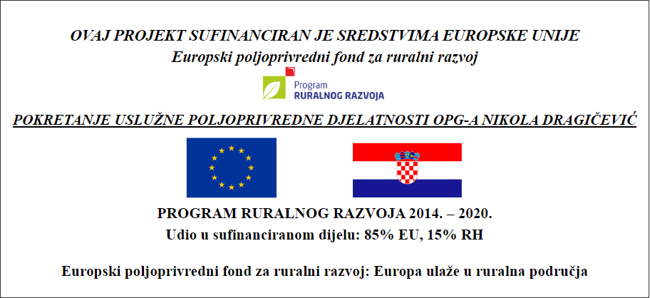 Naše gospodarstvo nudi uslugu košnje trave, skupljanja sijena i rolo baliranja. Raspolažemo suvremenom mehanizacijom koja je potrebna za obavljanje djelatnosti.